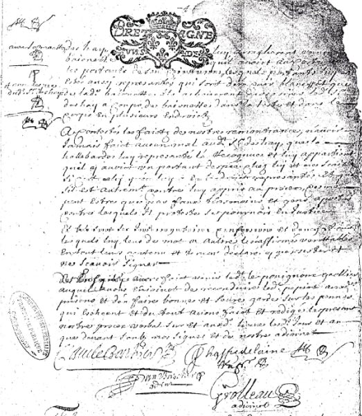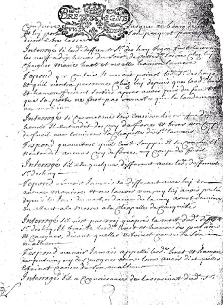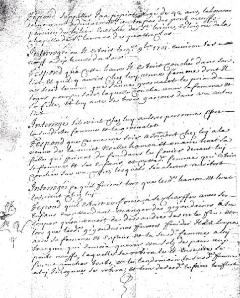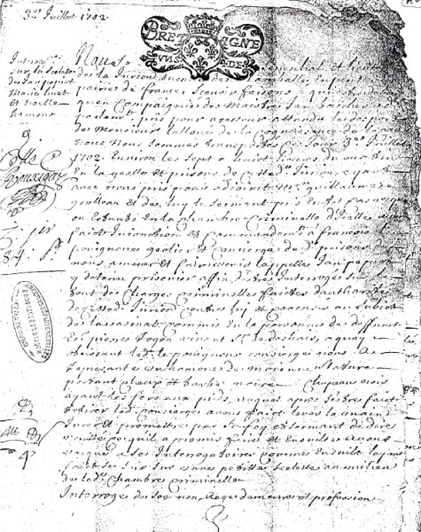 Interrogatoire sur la scellette de Jan Pepiot, Marie Huet et Noelle Hamon Nous Sénéchal et lieutenant de la juridiction de Lamballe en Penthièvre pairie de France, savoir faisons à qui être (illisible) qu’en compagnie des Maistre Jan Boscher du dit parlement pris pour assesseur attendu les dépositions de Monsieur Lallouée de la connaissance de l’épouse, nous nous sommes transportés ce jour 3ème juillet 1702, environ les sept à huit heures du matin et la geole et prison de cette dite juridiction ayant avec nous pris pour adjoint Mr Guillaume Grolleau et de lui le serment pris en (illisible) ou estant en la chambre criminelle d’icelle ayant fait injonction et commandement à François Le Pouignoux, geolier et concierge de la prison de nous amener et faire (illisible) l’appelle Jan Pepiot y détenu prisonnier afin d’être interrogé sur la (illisible) des charges criminelles faites d’autorité de cette juridiction contre lui et (illisible) au sujet de l’assassinat commis en la personne du défunt Ecuyer Pierre Rogon, vivant sgr des Hay à quoi en obéissant, le dit Le Pouignous, concierge nous a représenté un homme de moyenne stature portant cheveux et barbe noire, chapeau noir ayant les fers aux pieds auquel après s’être fait retirer le dit concierge avons faict lever la main, jurer et promettre par sa foi et serment de dire vérité ce qu’il a promis faire et ensuite avons vacqué à ses interrogatoires comme ensuite l’ayant fait asseoir sur une petite scellette au milieu de la dite chambre criminelle.