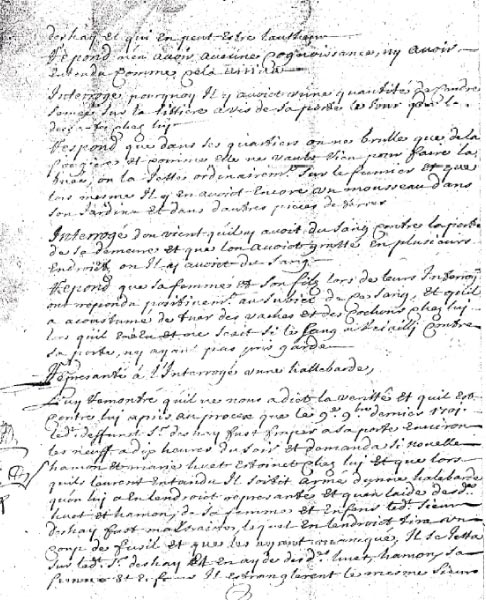 • Lui démontré qu’elle n’a dit la vérité et qu’il est contre elle appris aux charges que la nuit du 9ème novembre dernier 1701 ayant feint d’aller chercher du feu chez le dit Pepiot et y estante, le dit défunt sgr des hay frappa à la porte du dit Pepiot et demanda si Marie Huet y était, sur quoi la porte fut ouverte et lors se jeta sur le dit sgr des hay et en l’aide de sa dite fille, du dit Pepiot et femme et enfants le maltraitèrent et pas les moyens de sa cravatte l’etranglèrent et l’achevèrent de l’assassiner de coups d’une baionnète qu’ils lui arrachèrent du côté