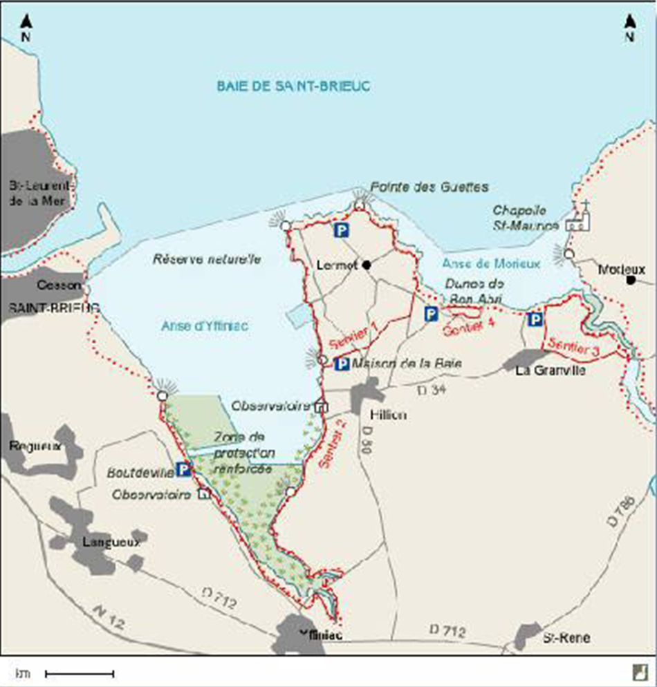 La plus grande Réserve de Bretagne est un haut lieu ornithologique. Scindée en deux anses (l’anse d’Yffiniac et l’anse de Morieux) qui forment une zone humide d’intérêt international, elle a été classée Réserve naturelle en 1998 car elle assure la protection d’une faune et d’une flore qui prospèrent en toute tranquillité. Depuis toujours carrefour de migration, certains oiseaux aiment à y faire étape tandis que d’autres y ont élus domicile pour leur nidification. Au gré des sentiers de la Baie et selon les époques, ce ne sont pas moins de 40 000 oiseaux de 112 espèces différentes qui peuvent être observées à loisir. Notamment les oies bernaches viennent en nombre (plus de 4 000), mais leur nombre diminue ces dernières années.