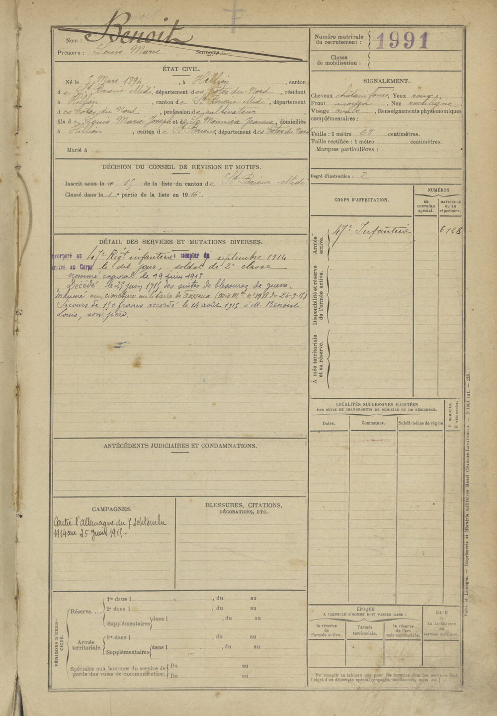 Les Hillionnais ont participé à toutes les grandes batailles de cette guerre sur le sol français, les batailles de « la Marne », de « la Somme », « du Chemin des Dames », parfois même à l’étranger dans l’armée d’Orient. En cette année 2016, nous commémorons le centenaire de la bataille de Verdun et nous ne pouvions omettre de distinguer le parcours de 8 hillionnais ayant participé à cet enfer. Des 8 soldats présents à Verdun, 4 n’en reviendront pas : Louis-Marie COLLET, Armand LE BRETON, François TUAL et Jean-Louis SOUPLET ; les 4 autres seront blessés dont Jean RENAULT de Saint-René, incorporé dans le 1er Zouave, qui sera touché par un éclat d’obus dès le début de l’offensive allemande le 27 février 1916 à Douaumont. Ironie du destin, il sera également blessé par balle à Craonne lors du 1er jour de l’offensive française du Chemin des Dames le 16 avril 1917.