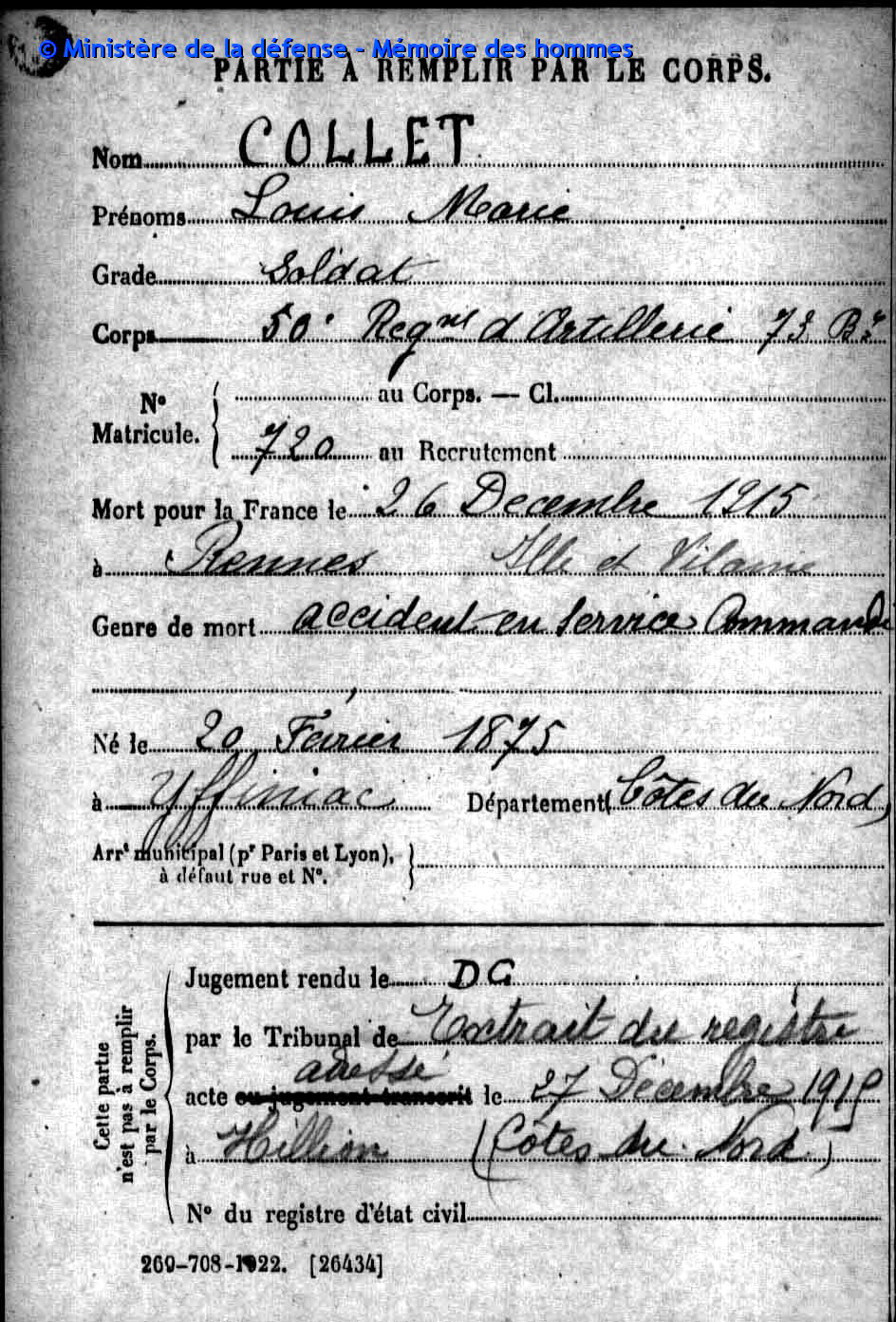 - Pierre-Marie FEURGAT, mort le 24 février 1915 à l’hôpital de Cherbourg (50), marin, non déclaré mort pour la France
