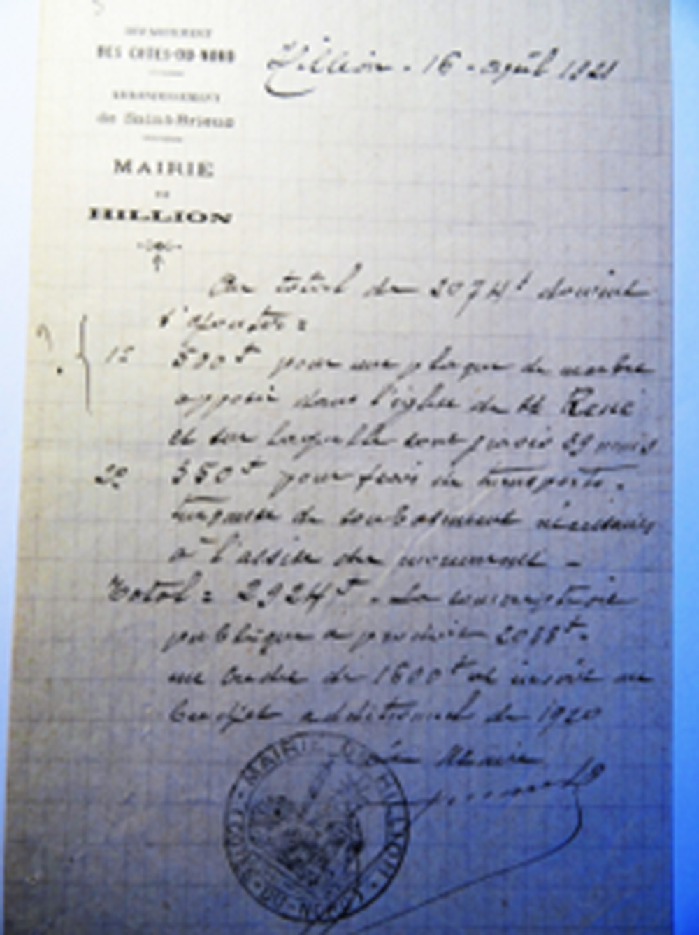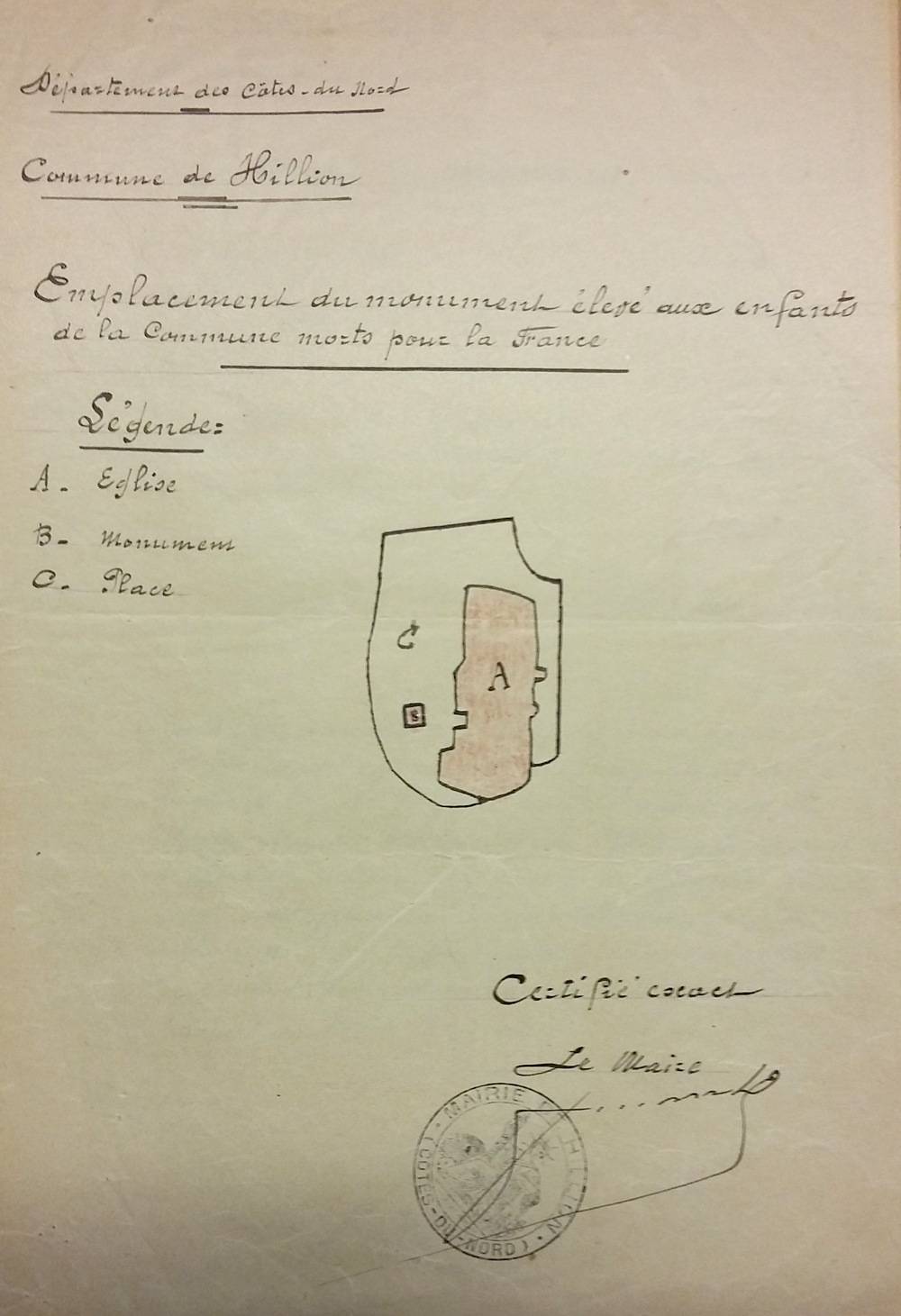 La conception des monuments est laissée à l’appréciation des communes. En 1920, la municipalité de Hillion, désormais tenue par les radicaux-socialistes vote la création d’un monument aux morts à Hillion. Elle désire un monument neutre et laïc. Le recteur refuse de le bénir s’il n’y a pas une croix. On tergiverse et finalement, il est accepté une petite croix sur le sommet. (fiche 010902).