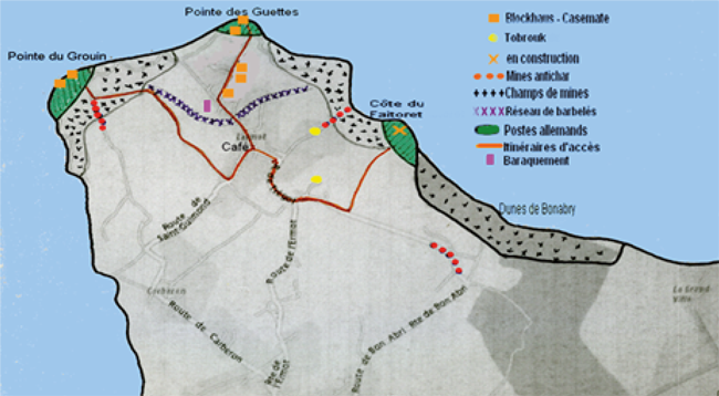 « En 1943, des travaux de fortifications furent entrepris sur toute la côte (blockhaus, emplacements pour canons et mitrailleuses etc..) dirigés par des membres de l’organisation Todt reconnaissables à leur brassard. Beaucoup d’hommes étaient réquisitionnés venant de très loin. Des charrettes, quelques camions dont celui de Louis Hamon à gazogène, transportaient du ciment, du gravier venant d’Erquy vers la Pointe du Grouin en empruntant le chemin du Moulin à Vent qui avait été gravillonné. Les mêmes opérations se faisaient du côté de la Pointe des Guettes. Tout le rez-de-chaussée de la maison des Richard Ker Armor était rempli de sacs de ciment.