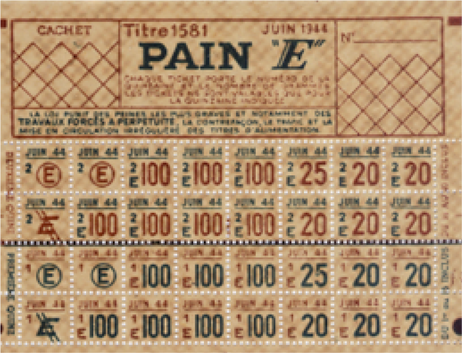 Les tickets de rationnement firent leur apparition en septembre 40. Ces petits timbres multicolores portaient des numéros. Il y en avait pour le pain, la viande, les matières grasses, le sucre, la farine etc… Toutes les denrées de première nécessité. Il existait un classement: J 1 pour les enfants, J 2 de 6 à 12 ans, J 3 pour les adolescents jusqu’à 17 ans catégorie plus généreuse, et au-dessus les travailleurs de force. L’appellation J 3 resta longtemps comme désignant les jeunes, précurseurs des blousons noirs.