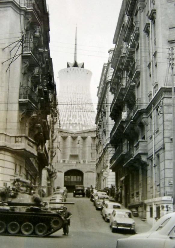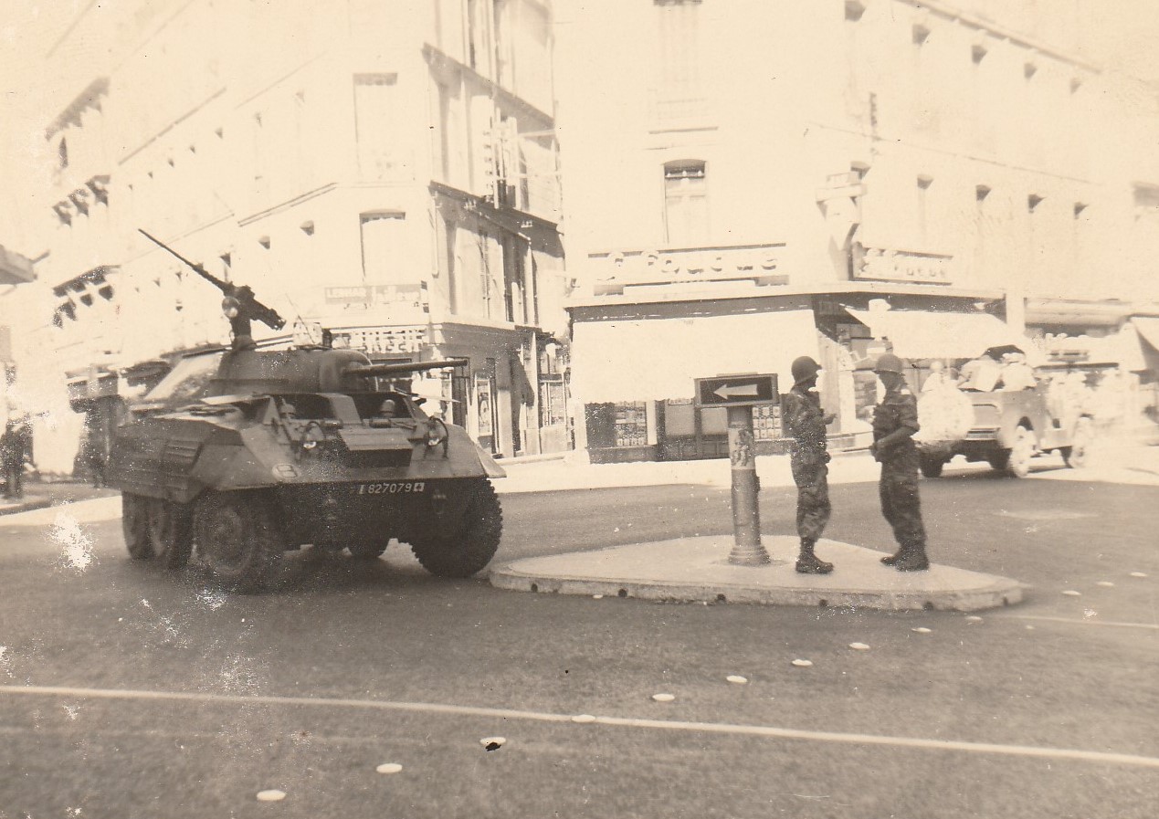 Le 20 mai 1962 : fusillade rue de Lyon. En patrouille à bord d’un scout-car armé de mitrailleuse de 12,7 nous fonçons pour nous sortir rapidement de cette rue; les bombes placées dans des immeubles ou des magasins explosent derrière nous. Des débris sont projetés en l’air puis retombent un peu partout. Nous sentons un moment le souffle d’une explosion à l’angle d’une rue. Drôle de spectacle, ça sent la poudre! L’O.A.S. plastique les villas et les immeubles abandonnés par la population qui fuit l’Algérie. Les murs sont tagués d’inscriptions : « OAS frappe où elle veut et quand elle veut », « OAS vaincra », « Vive les pieds noirs », « de Gaulle = Kroutchev », « CRS SS » , etc.