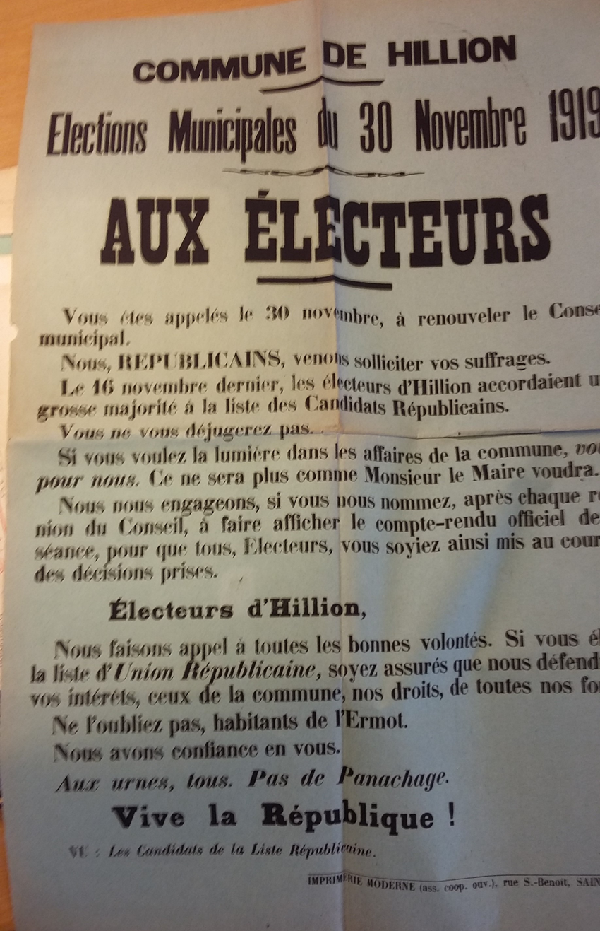 C’est un changement radical à Hillion où, depuis plus d’un siècle, le pouvoir municipal est soumis au pouvoir nobiliaire. Et ce dernier est très lié au clergé encore traumatisé par la loi de 1905. A partir de cette date et sans interruption jusqu’en 1989, la commune sera de gauche et se déterminera un comportement laïque.