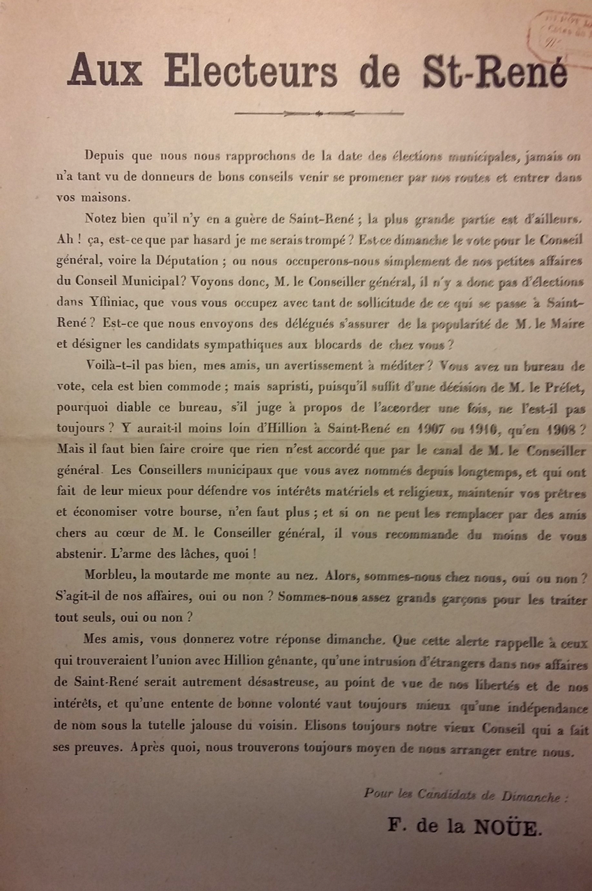 Les 50 ans de pouvoir de la famille Du Fou de Kerdaniel à la mairie de Hillion commencent à trouver après le conflit de 14-18 des opposants motivés.
